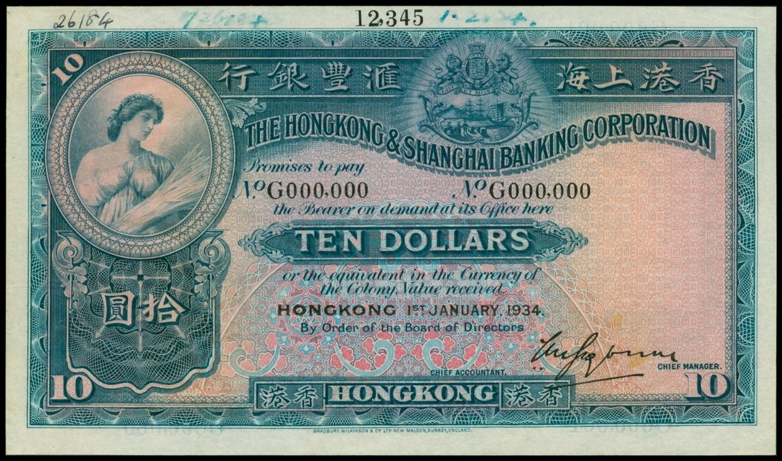 The HongKong and Shanghai Banking Corporation, $10, specimen proof, 1.1.1934, serial number G000000, control numbers G600001 to G800000, green and pink, Ceres top left, coat of arms right of top centre, reverse green, angle playing a trumpet above the old HSBC building,