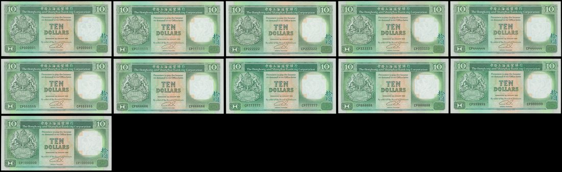 The HongKong and Shanghai Banking Corporation, a set of 11 lucky number notes, $10, 1.1.1990, same prefix CP 000001, 111111 to 1000000, green and brown on multicoloured underprint, coat of arms at left, watermark of a lion at right, reverse green, two lions flanking the HSBC building,