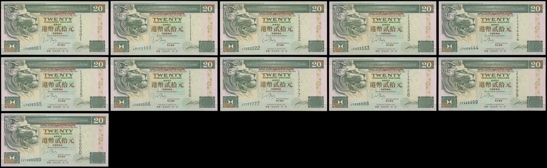 The HongKong and Shanghai Banking Corporation, a set of 11 lucky number notes, $10, 1.1.1999, same prefix LF 000001, 111111 to 1000001, dark green and multicolour, lion at left, view of Victoria Harbour at centre and lion watermark at right, lions flanking the HSBC building on reverse,