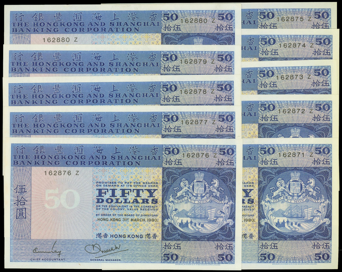 The HongKong and Shanghai Banking Corporation, consecutive run of 10x $5, 31.3.1980, serial numbers 162871-880 Z, blue, coat of arms at right, watermark of a helmeted warrior at left, reverse blue, bank building at left, geometric design at right,