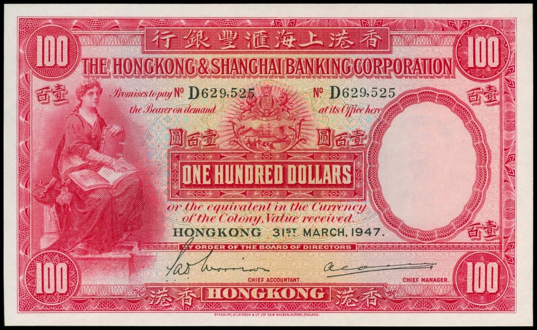 The HongKong and Shanghai Banking Corporation, $100, 31.3.1947, serial number D629525, red on multicoloured underprint, maiden at left, arms top centre, value at centre and each corner, manuscript signatures at bottom, reverse red, bank building at centre, angel above,