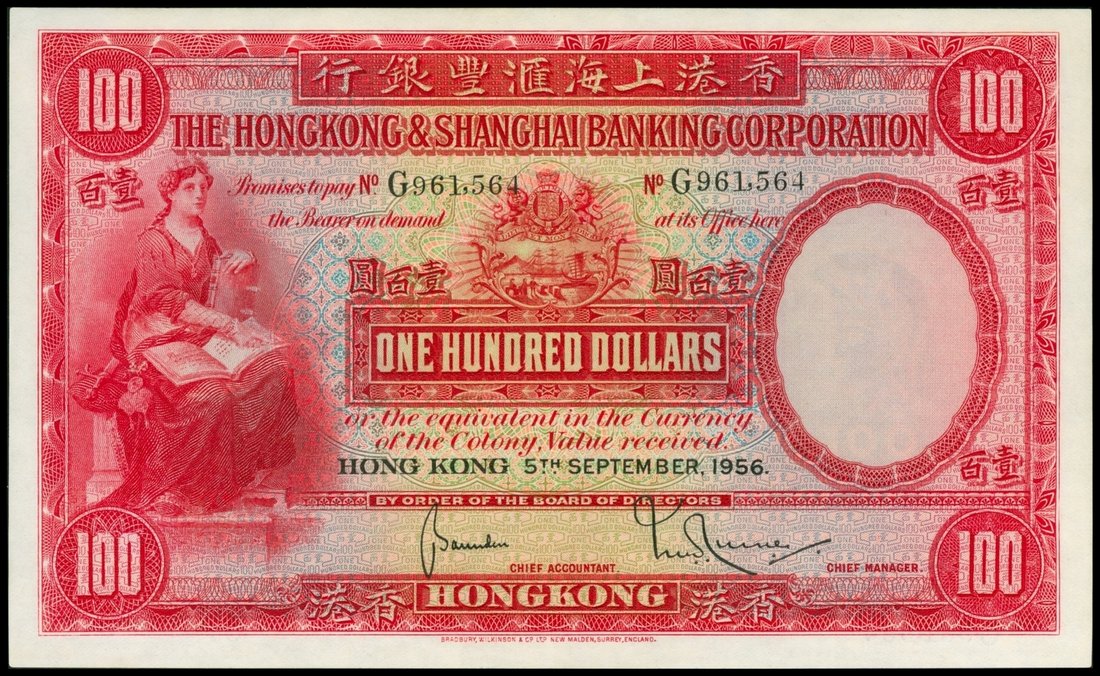 The HongKong and Shanghai Banking Corporation, $100, 5.9.1956, serial number G961564, red on multicoloured underprint, maiden at left, arms top centre, value at centre and each corner, manuscript signatures at bottom, reverse red, bank building at centre, angel above, serial number at four corners,