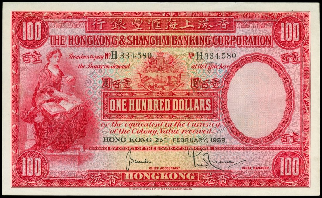 The HongKong and Shanghai Banking Corporation, $100, 25.2.1958, serial number H334580, red on multicoloured underprint, maiden at left, arms top centre, value at centre and each corner, manuscript signatures at bottom, reverse red, bank building at centre, angel above, serial number at four corners,