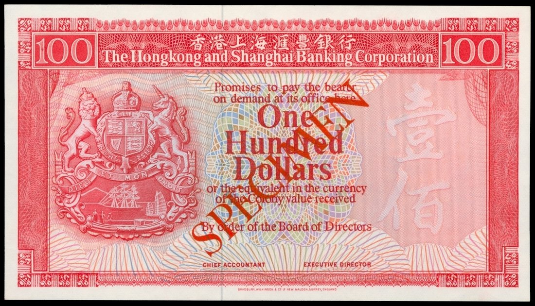 The HongKong and Shanghai Banking Corporation, $100, specimen/proof, without dates, signatures or serial numbers, red with multicoloured vignette at centre, coat of arms at left, watermark of lion at right, reverse red, green and multicoloured, two lions flanking the HSBC building at centre,