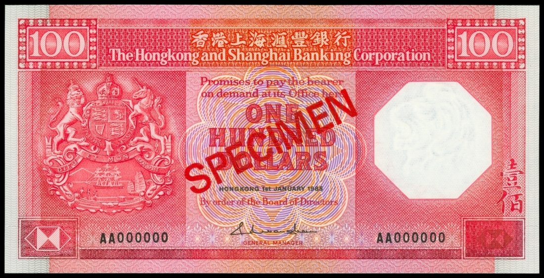The HongKong and Shanghai Banking Corporation, $100, specimen, 1.1.1985, serial number AA000000, deep red, coat of arms at left, hexagonal watermark area at right, reverse red, HSBC building and lions at centre,