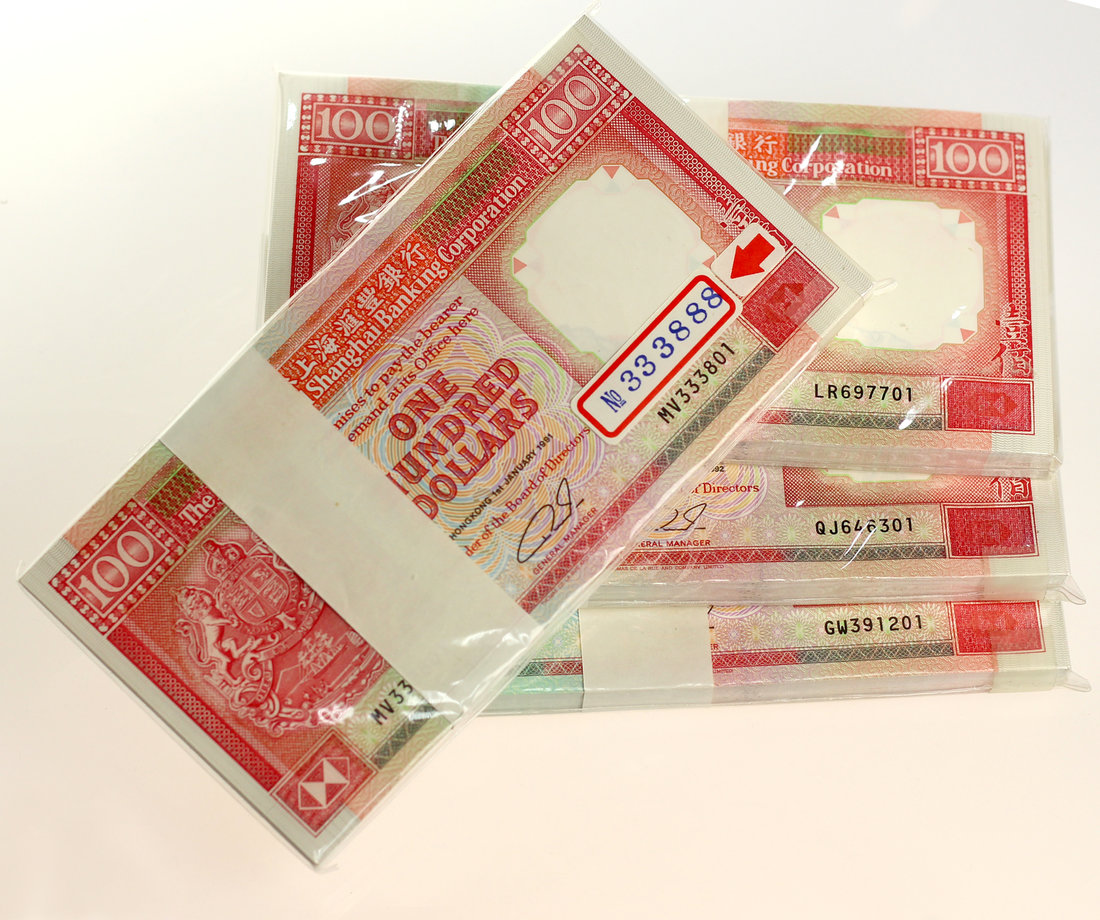 The HongKong and Shanghai Banking Corporation, group of 4 blocks of 100 consecutive $100, 1989 (GW), 1990 (LR), 1991 (MV) and 1992 (QJ), red and multicolour, coat of arms at left, hexagonal watermark area at right, reverse red, HSBC building and lions at centre,