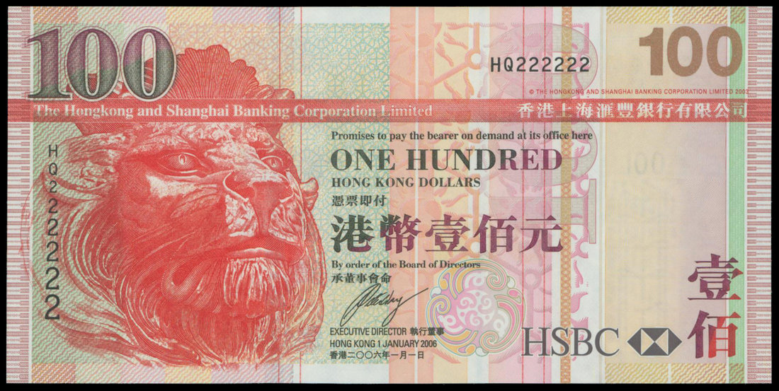 The HongKong and Shanghai Banking Corporation, $100, 2006, lucky serial number HQ222222, red and multicolour, lion at left, watermark of the HSBC building at right, Tsing Ma Bridge on reverse,