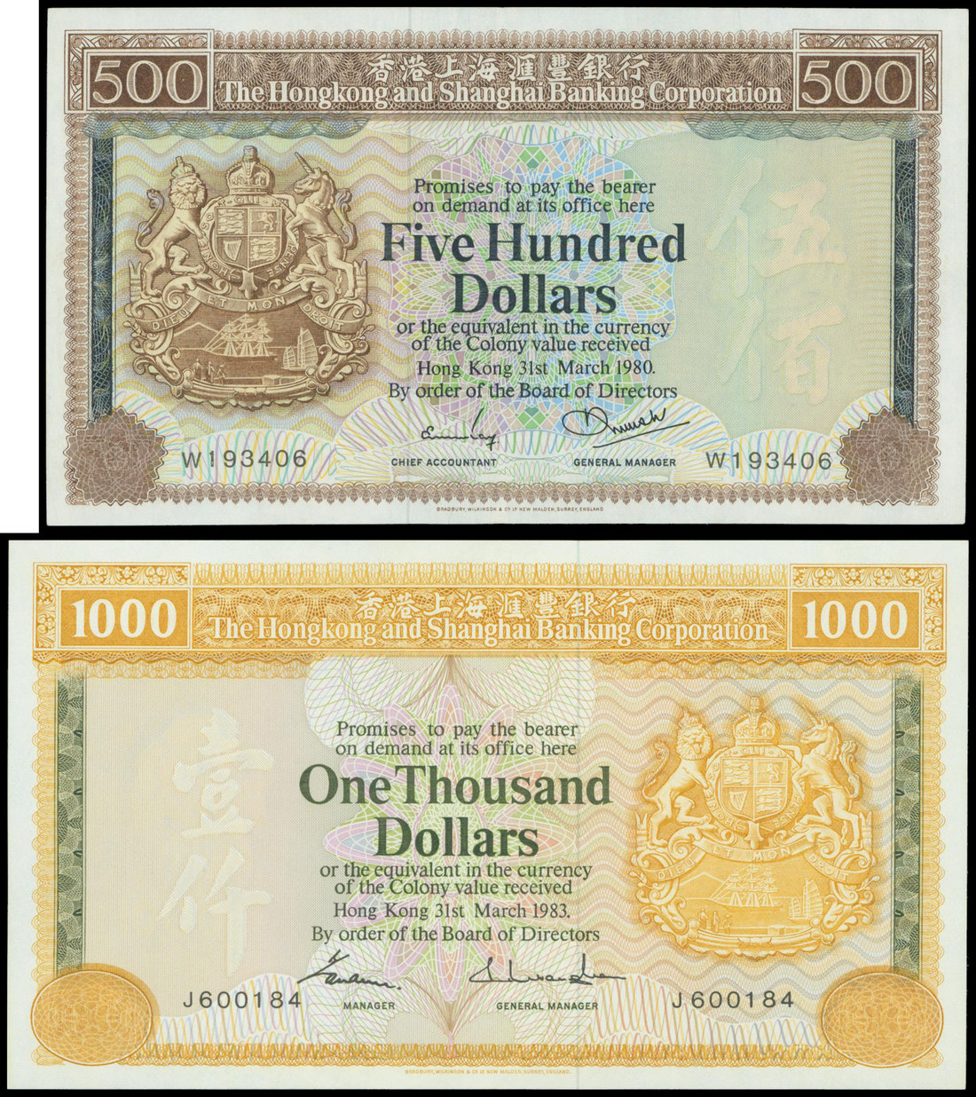 The HongKong and Shanghai Banking Corporation, lot of 2 notes, $500, 31.3.1980 and $1000, 31.3.1983, serial numbers W193406 and J600184 respectively,