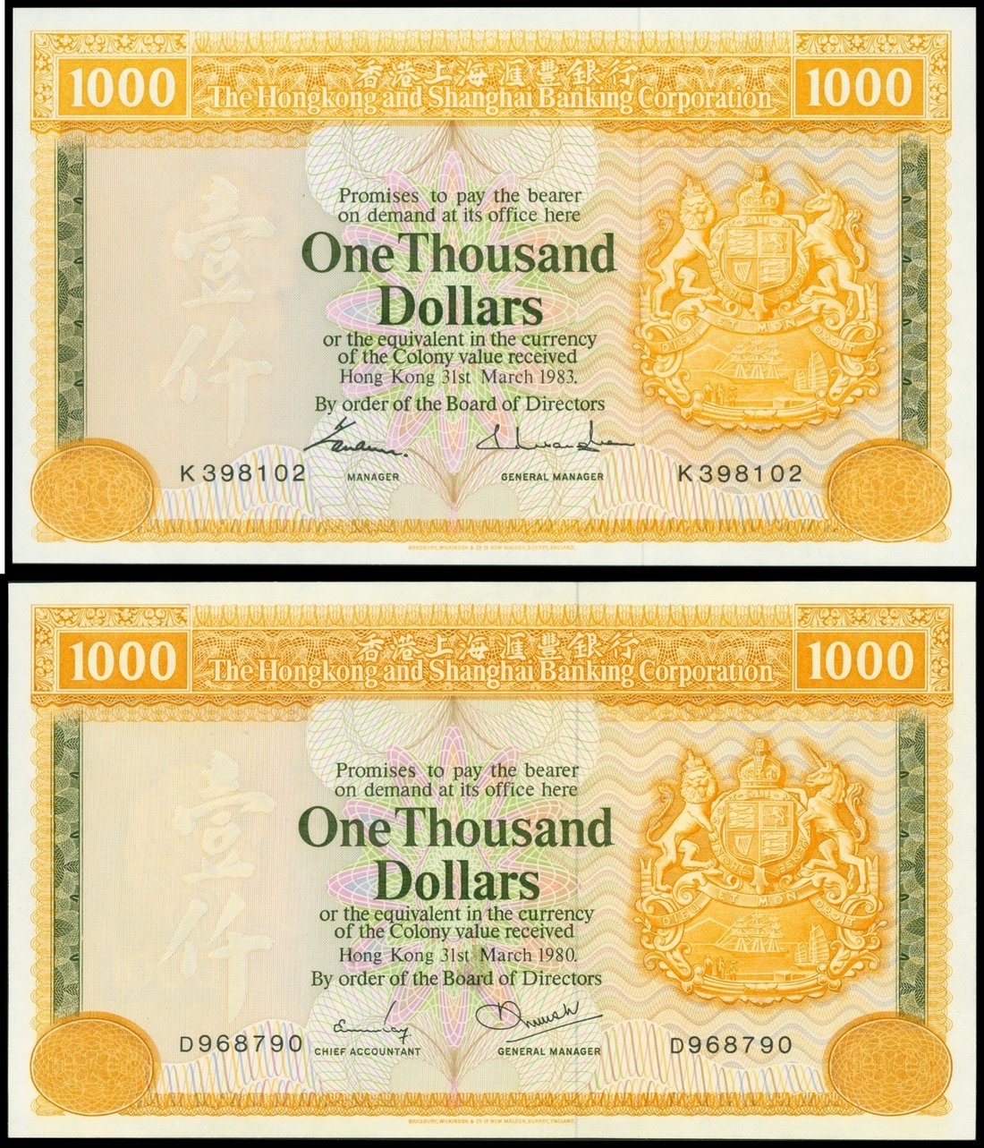 The HongKong and Shanghai Banking Corporation, lot of 2x $1000, 31.3.1980 and 31.3.1983, serial number D968790 and K398102, yellow on multicoloured, Royal crest at right, 'One Thousand' in Chinese characters underprinted at right, reverse yellow and grey, howling lion at left,