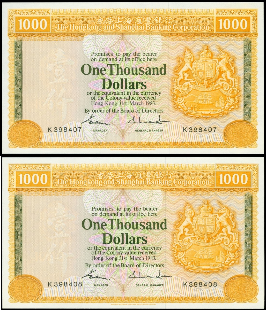 The HongKong and Shanghai Banking Corporation, consecutive pair of $1000, 31.3.1983, serial number K398407-408, yellow on multicoloured, Royal crest at right, 'One Thousand' in Chinese characters underprinted at right, reverse yellow and grey, howling lion at left,
