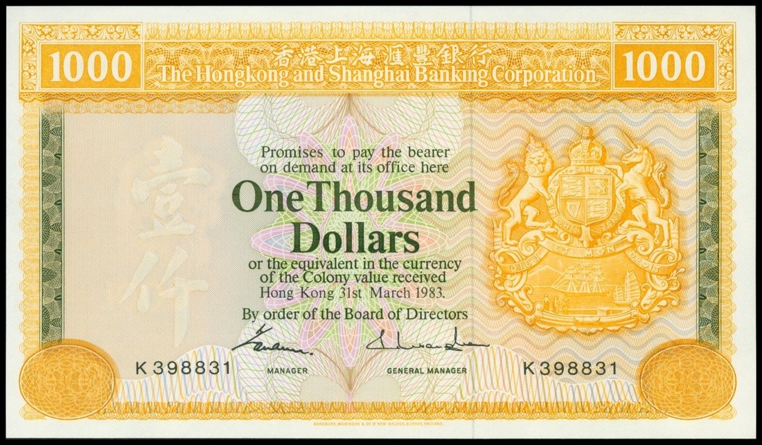 The HongKong and Shanghai Banking Corporation, $1000, 31.3.1983, serial number K398831, yellow on multicoloured, Royal crest at right, 'One Thousand' in Chinese characters underprinted at right, reverse yellow and grey, howling lion at left,