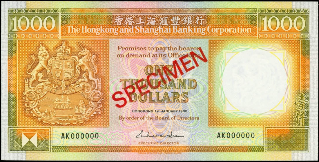 The HongKong and Shanghai Banking Corporation, $1000, specimen, 1.1.1988, serial number AK000000, yellow and green on multicoloured underprint, arms at left, watermark at right, reverse shows the HSBC building at centre, Supreme Court at right,