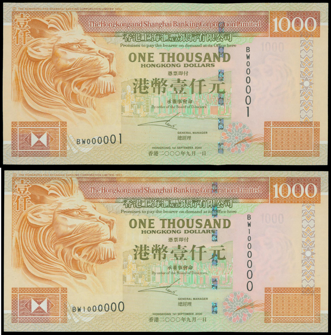 The HongKong and Shanghai Banking Corporation, a pair of $1000, 1.9.2000, lucky serial numbers BW000001 and BW1000000, yellow-orange and multicoloured, profile of a lion at left, view of Victoria Harbour at centre, lion watermark,