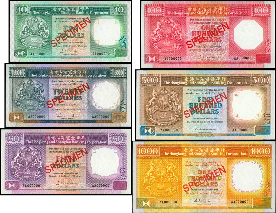 The HongKong and Shanghai Banking Corporation, a complete set of 6 specimens, 1985-1987 issue, consists of $20, $50, $100, $500 and $1000,