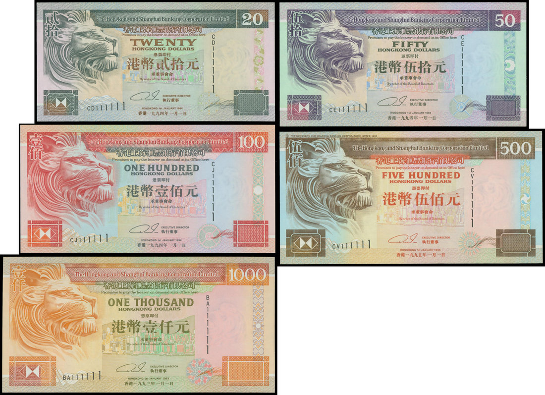 The HongKong and Shanghai Banking Corporation, a set of 5 denominations, $20, $50, $100, $500 and $1000 from the 1993 to 2002 series, all with the lucky solid number 111111, $20 (CD prefix), $50 (CE prefix), $100 (CJ prefix), $500 (CV prefix) and $1000 (BA prefix),