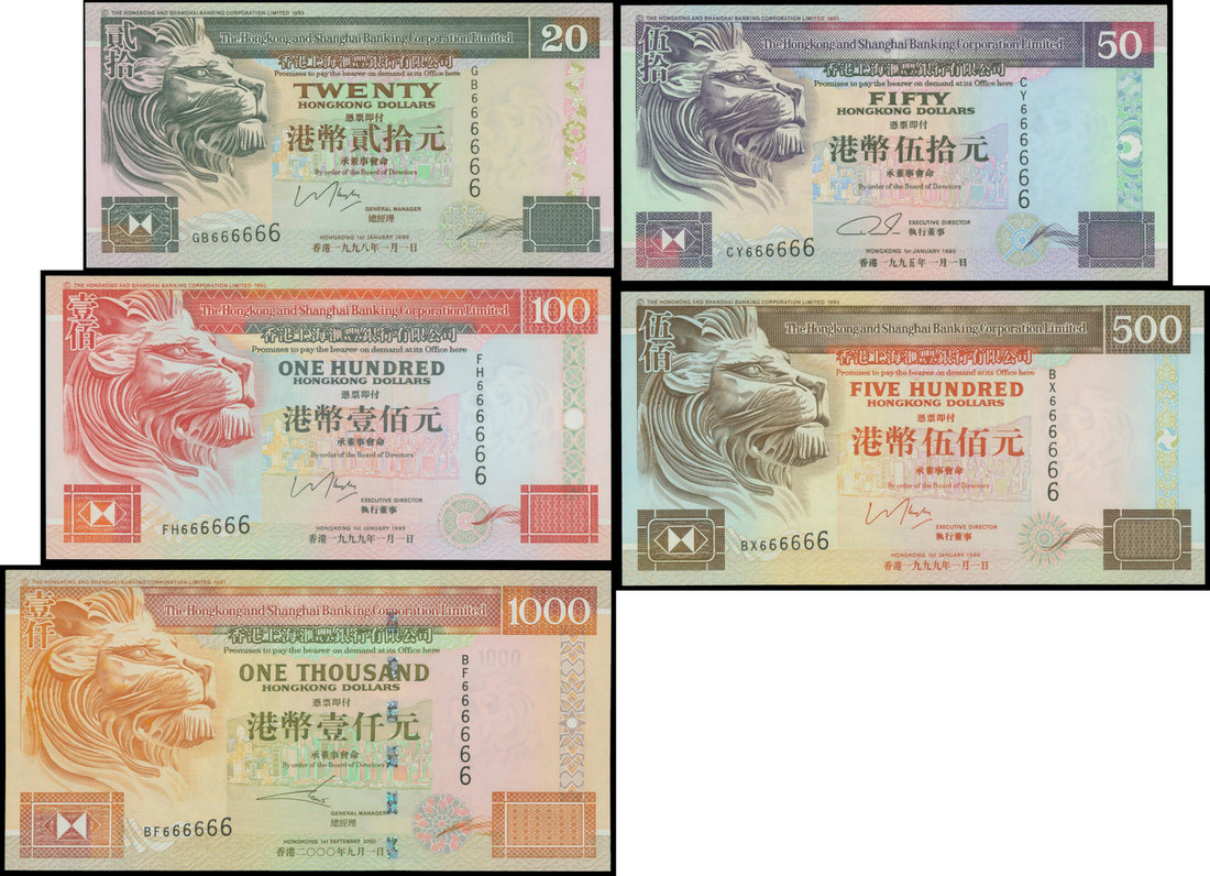 The HongKong and Shanghai Banking Corporation, a set of 5 denominations, $20, $50, $100, $500 and $1000 from the 1993 to 2002 series, all with the lucky solid number 666666, $20 (GB prefix), $50 (CY prefix), $100 (FH prefix) and $500 (BX prefix) and $1000 (BF prefix),