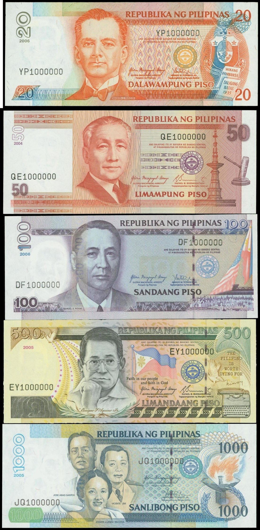 Philippines, a group of 5 lucky numbers, for 20, 50, 100, 500 and 1000 pesos, different prefixes but all with the same '1000000' (one million) number,