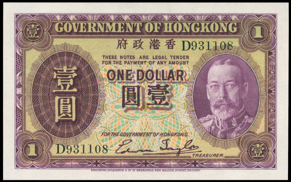 Government of Hong Kong, $1, no date (1935), serial number D931108, purple on yellow and multicolour, King George V at right, denomination at each corner, reverse purple, simplet vignette at centre with the denomination in Chinese and English,