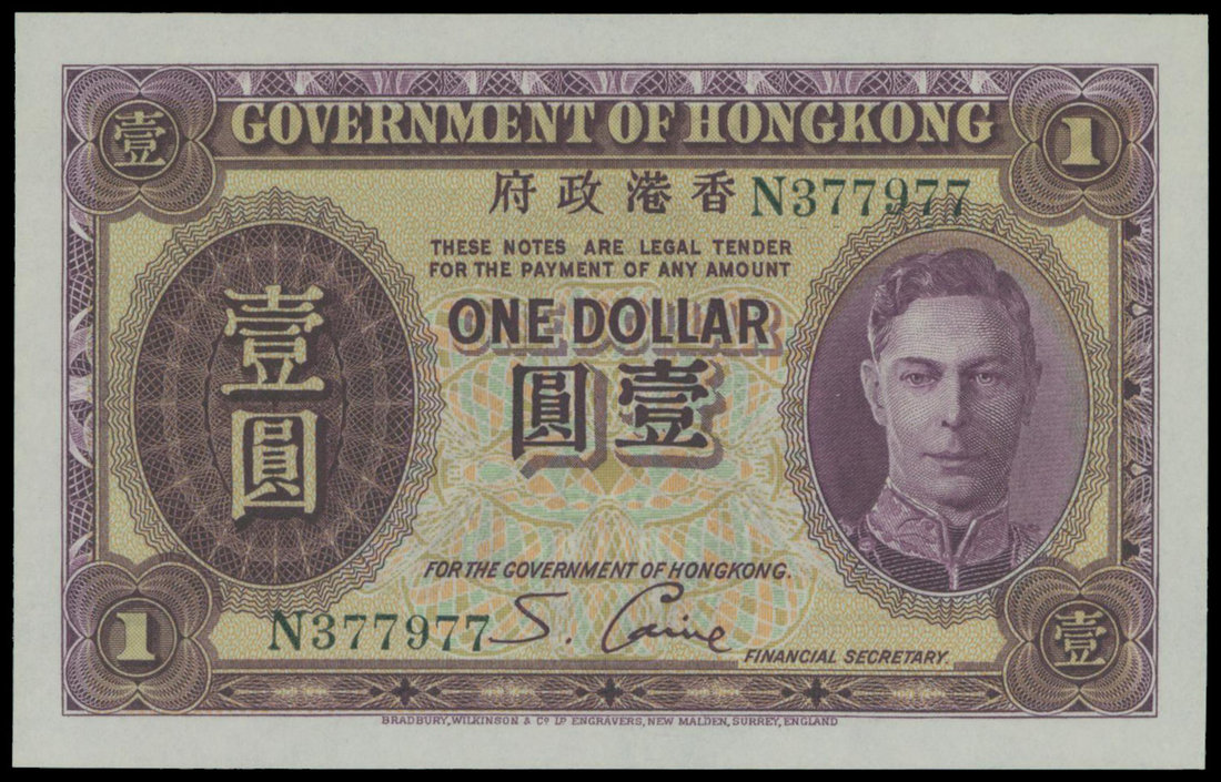 Government of Hong Kong, $1, no date (1936), serial number N377977, purple on yellow, George VI at right, '1' at each corner, reverse purple, English text,