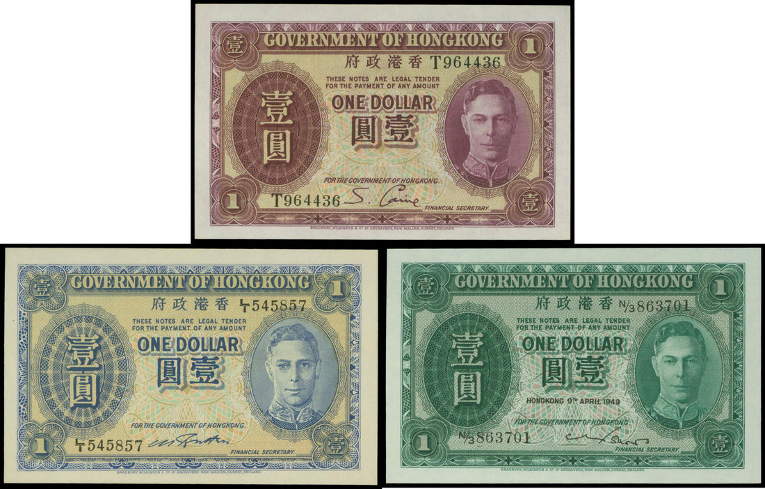 Government of Hong Kong, set of 3x $1, all featuring George VI, purple, serial number T964436, blue, serial number L/1 545857 and green,1949, serial number N/3 863701,