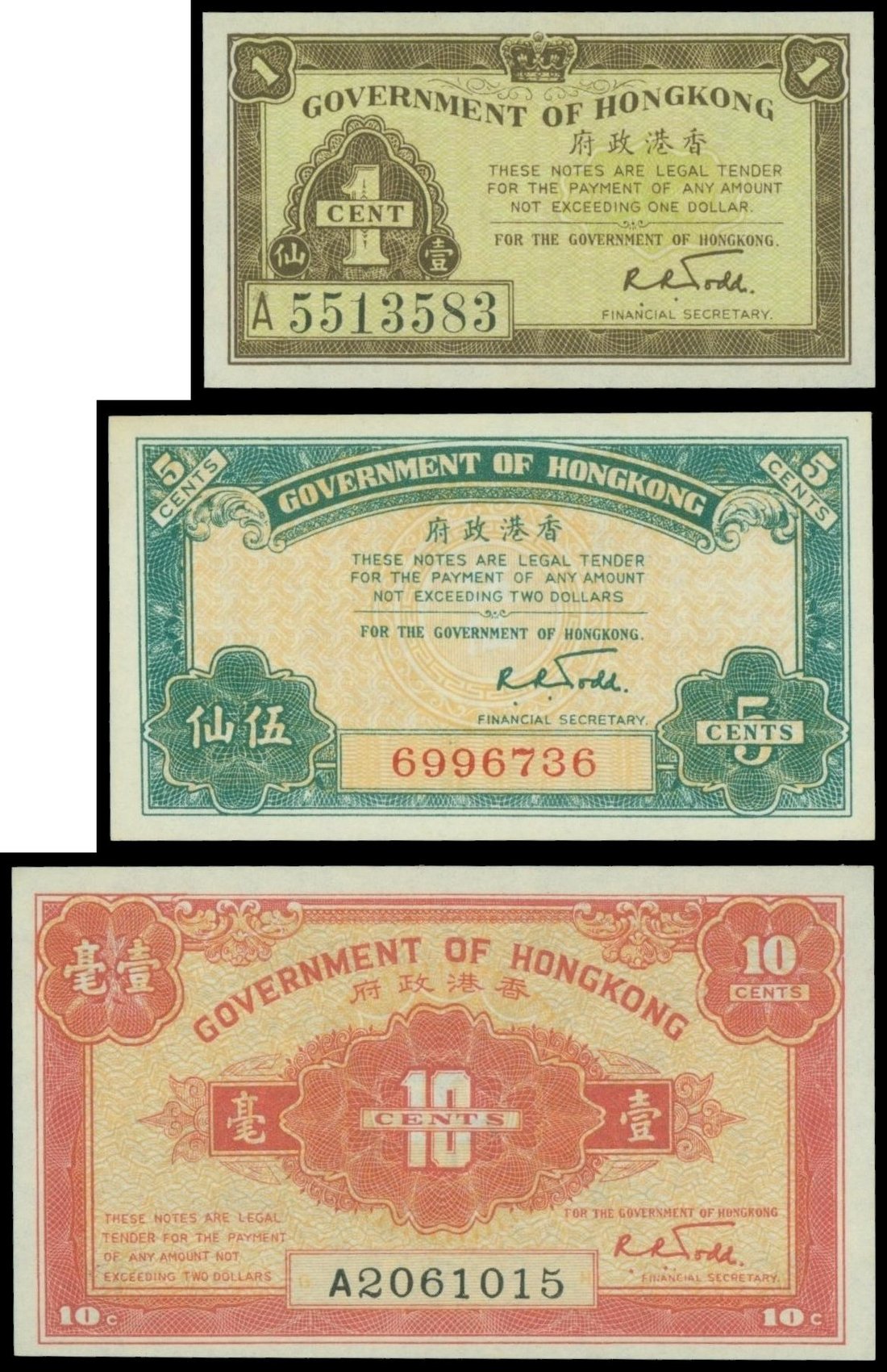 Government of Hong Kong, set of 3x fractional notes,1940's, 1, 5 and 10 cents,