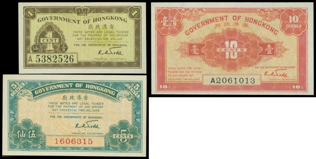 Government of Hong Kong, set of 3x fractional notes,1941's, 1, 5 and 10 cents,