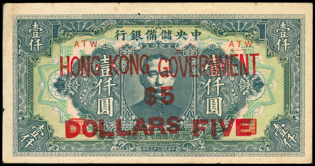 Government of Hong Kong, $5 emergency issue overprinted on Central Reserve Bank of China 10,000 yuan, Sun Yat Sen at centre, red overprint,