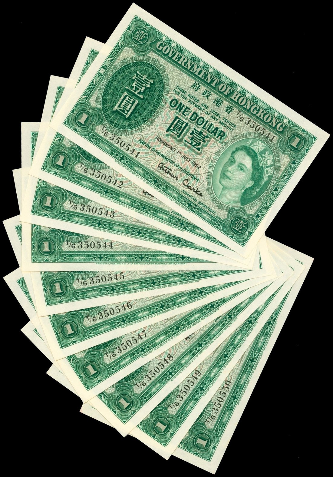 Government of Hong Kong, a run of 10x consecutive $1, 1.7.1952, serial number T/6 350541 to 550, green and multicoloured, Elizabeth II at right,