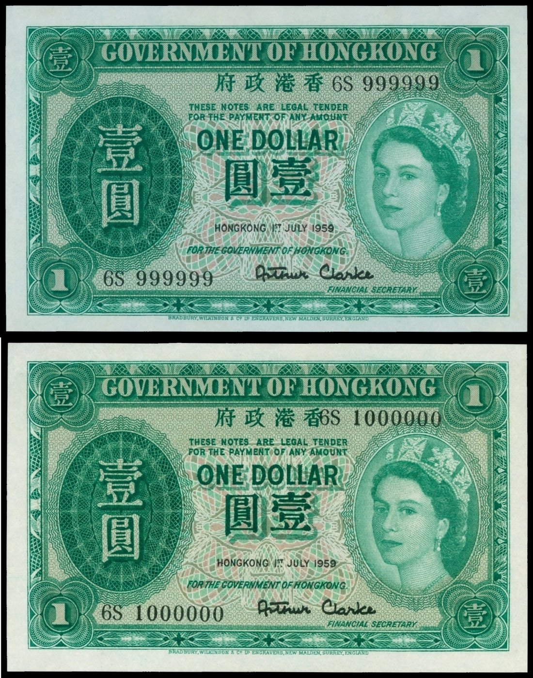 Hong Kong Government, a pair of $1, 1959, solid serial number 9 and 1 million serial number, same prefix 6S, green on multicolour underprint, Elizabeth II at right,
