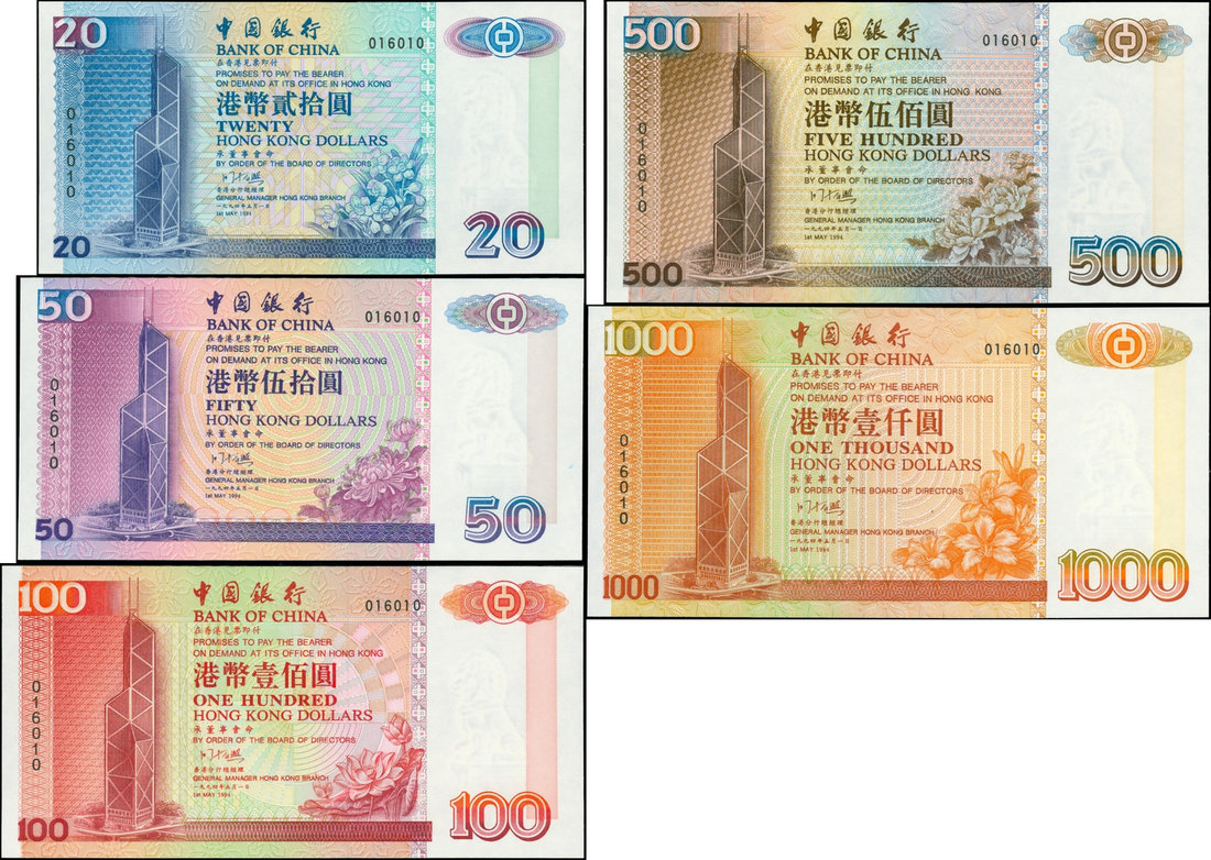Bank of China, a set of $20, $50, $100, $500 and $1000, 1994, without prefix and all bearing the same serial number 016010, blue, purple, red, brown and orange respectively, bank building at left,