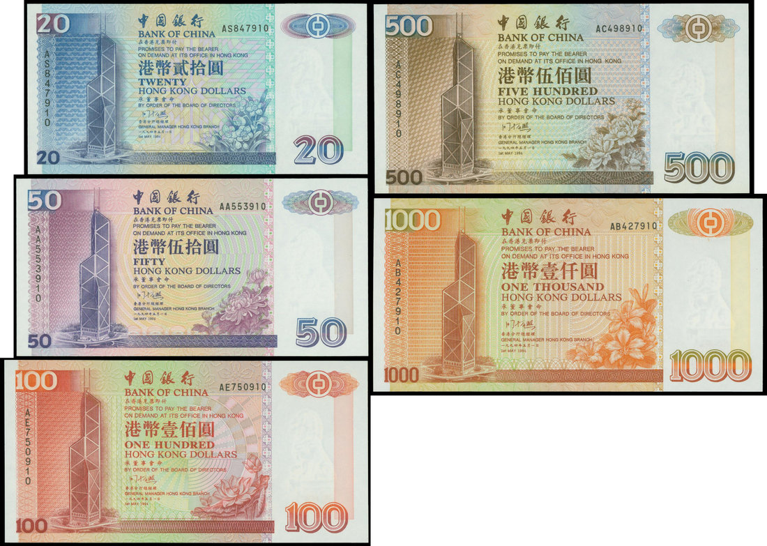 Bank of China, a set of 5 notes, $20, $50, $100, $500 and, $1000, 1.5.1994, prefix begins with 'A', bank building at left, watermark at right,