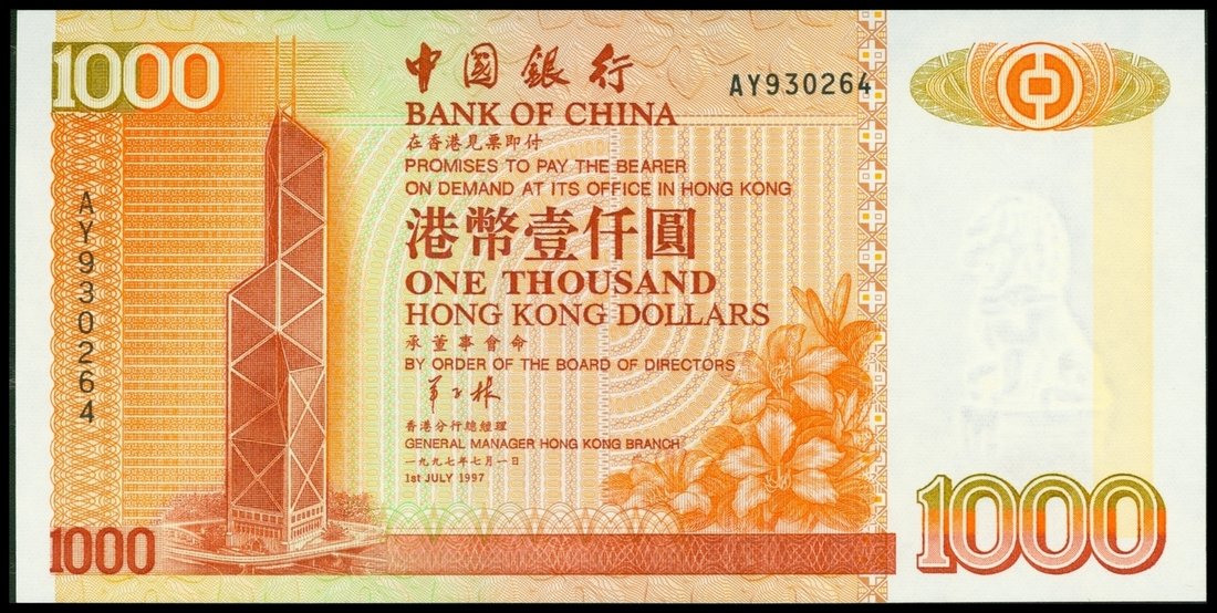 Bank of China, $1000, 1997, black serial AY930264, orange and multicoloured, bank building at left, overview of Hong Kong on reverse,