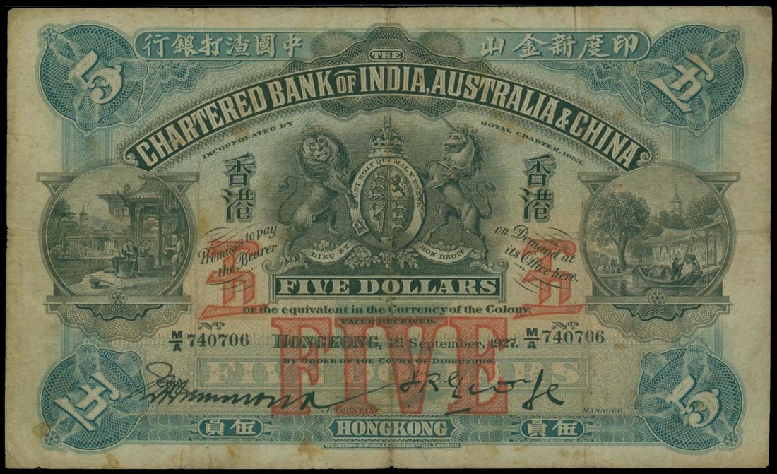 The Chartered Bank of India, Australia and China, $5, 1.9.1927, black serial M/A 740706, blue and black, pagoda at left, river scene at right, coats of arms at centre, 'FIVE' in red English and Chinese text, strong handsigned signature at bottom left, reverse red and black, bank building at centre, some brush annotations on reverse,