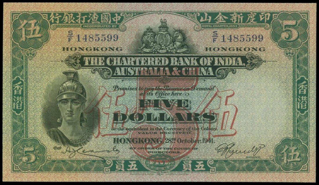 The Chartered Bank of India, Australia & China, $5, 28.10.1941, black serial S/F 1485599, green and multicoloured, helmeted warrior at left, watermark at right, reverse green, junk and sampan at centre,