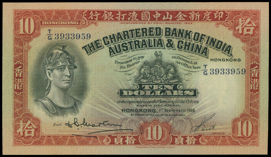 Chartered Bank of India, Australia and China, $10, 1 September 1956, serial number T/G 3933959red and pale green, helmeted soldier at left, arms at centre right, two printed signatures at bottom left and right, reverse red,