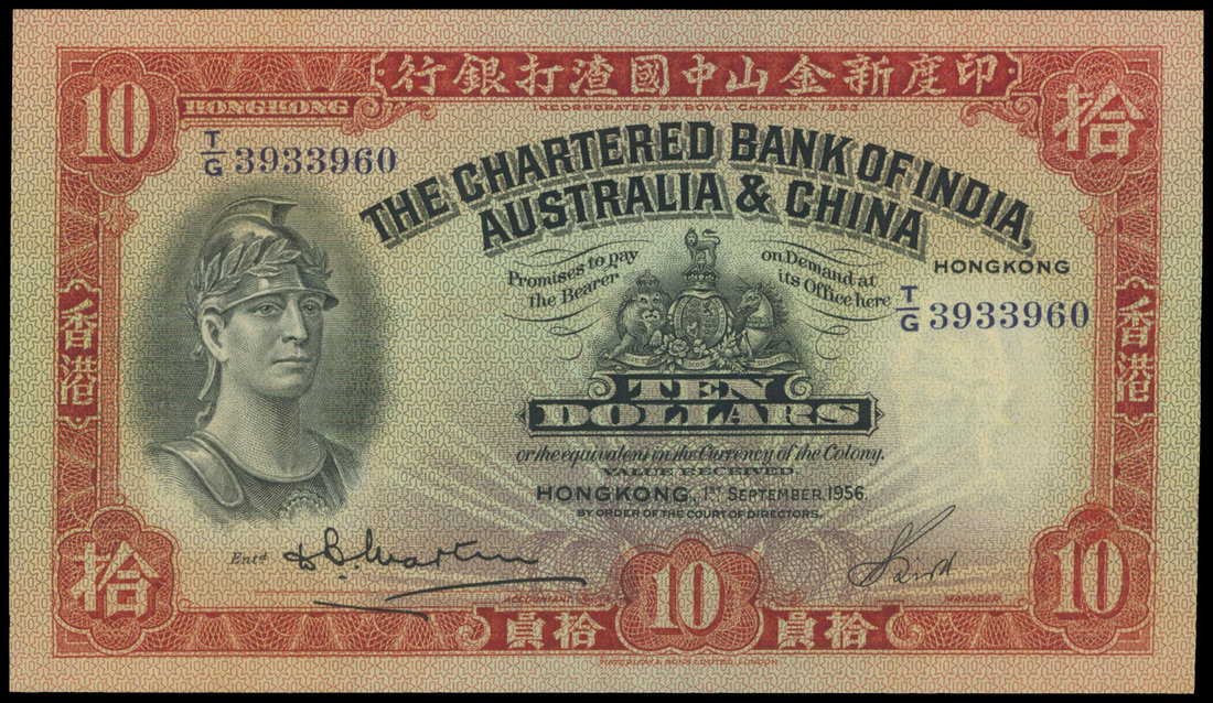 Chartered Bank of India, Australia and China, $10, 1 September 1956, serial number T/G 3933960red and pale green, helmeted soldier at left, arms at centre right, two printed signatures at bottom left and right, reverse red,
