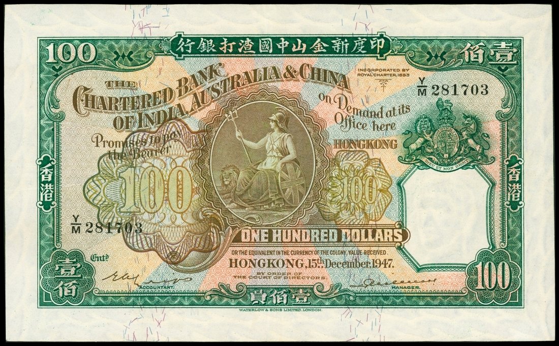 The Chartered Bank of India, Australia and China, $100, 15.12.1947, black serial Y/M 281703, green and multicoloured, Britannia at centre, old Supreme Court on reverse,