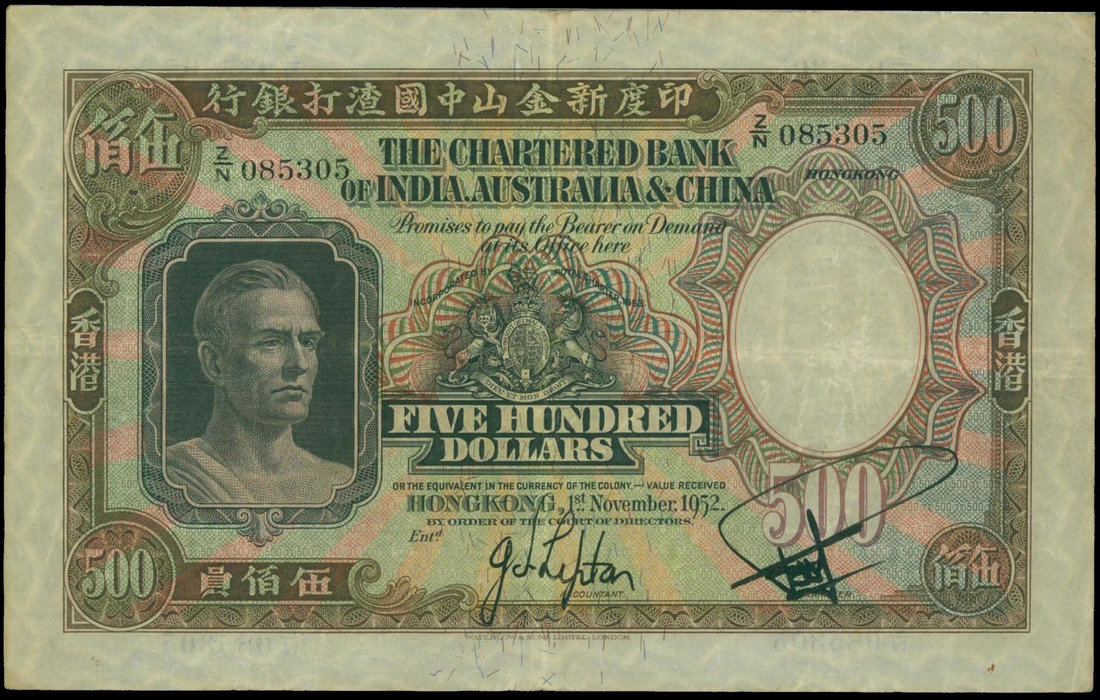 The Chartered Bank of India, Australia and China, $10, 1.11.1952, black serial Z/N 085305, brown and multicoloured, bust of man at left, coat of arms at centre, reverse brown, junk baot and sampan right of centre,