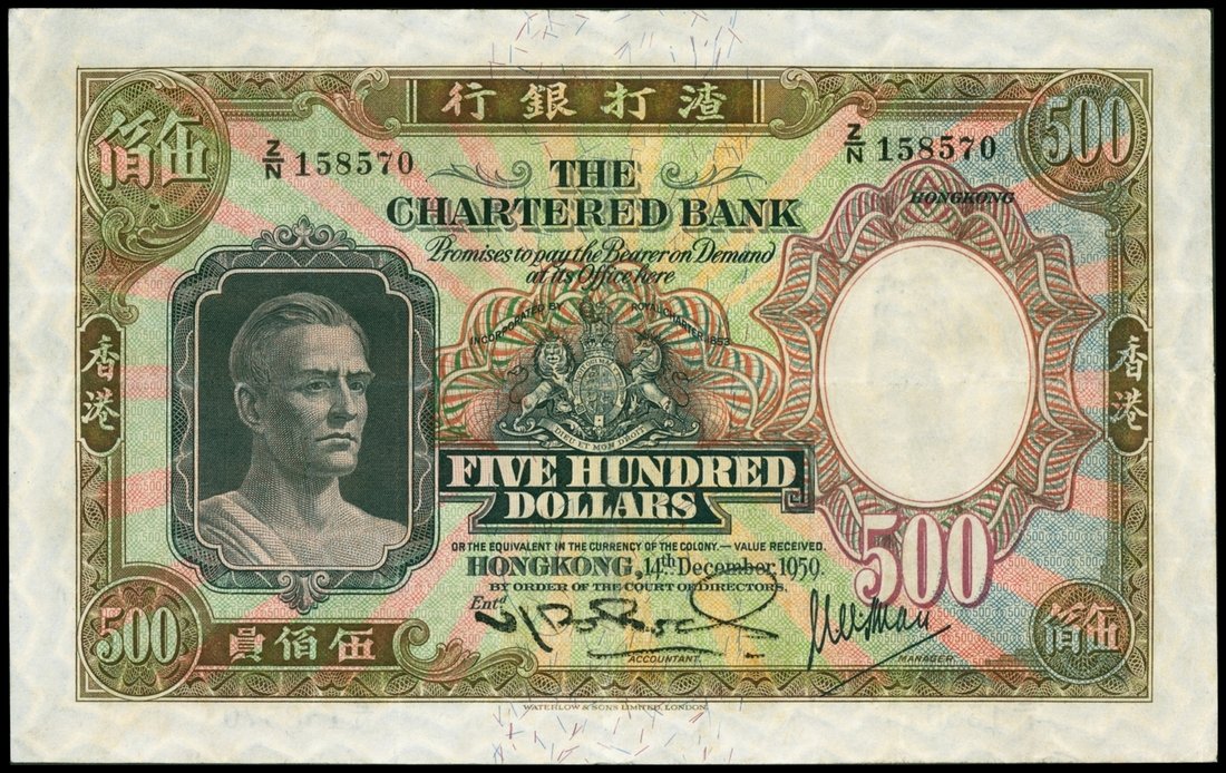 The Chartered Bank of India, Australia and China, $500, 14.12.1959, serial number Z/N 158570, brown and multicoloured, dark portrait of man at left, Royal Crest at centre, junk boat and harbour on reverse,