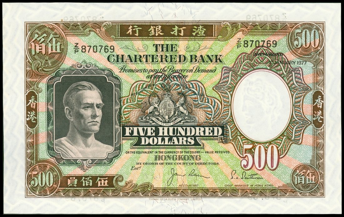 The Chartered Bank of India, Australia and China, $500, 1.1.1977, serial number Z/P 870769, brown and multicoloured, dark portrait of man at left, Royal Crest at centre, junk boat and harbour on reverse,