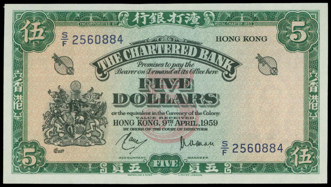 The Chartered Bank, $5, 9.4.1959, serial number S/F 2560884, green and multicoloured, keys left and right, coat of arms at left, reverse green, sampan at centre,