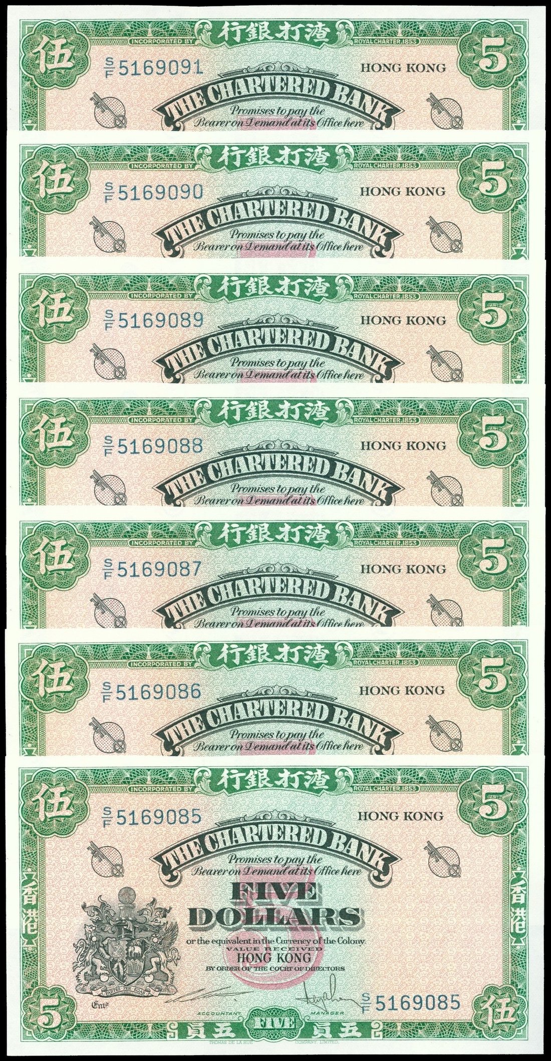 The Chartered Bank, consecutive 7 notes of $5, ND(1962-70), serial number S/F 5169085-91, green on multicolour underprint, arms at left, keys at top left and right, large red '5' at centre,