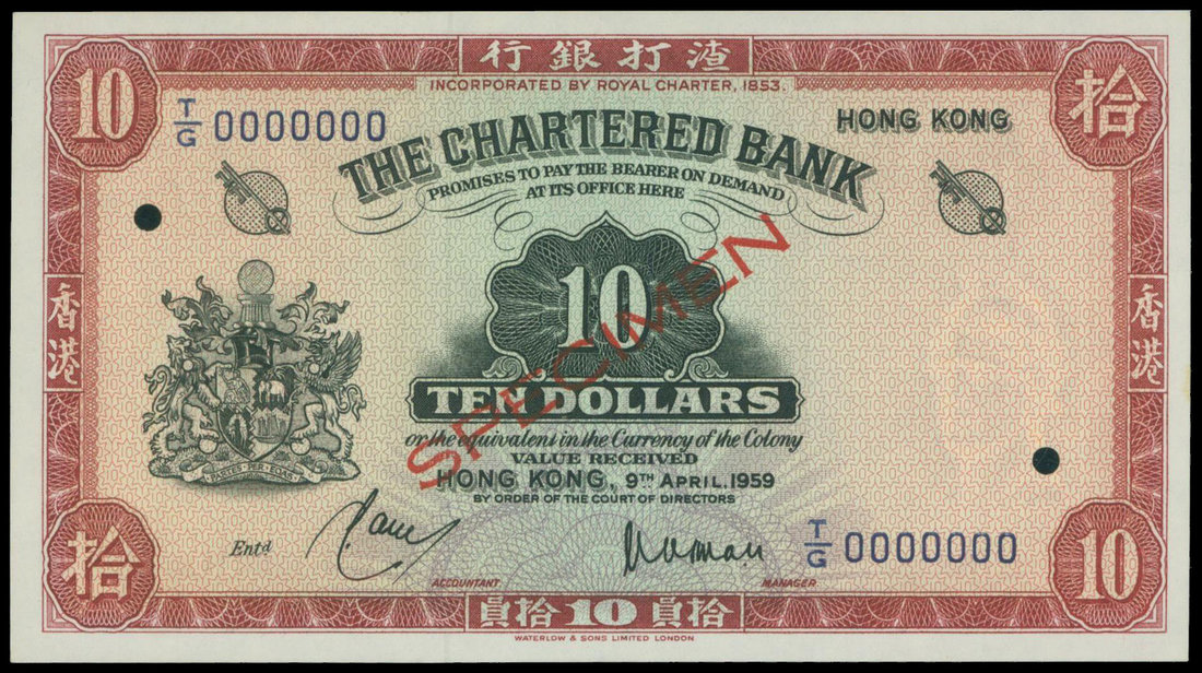 The Chartered Bank, $10, specimen, 9.4.1959, serial number T/G 0000000, red and multicoloured, keys left and right, coat of arms at left, reverse red, bank building at centre,