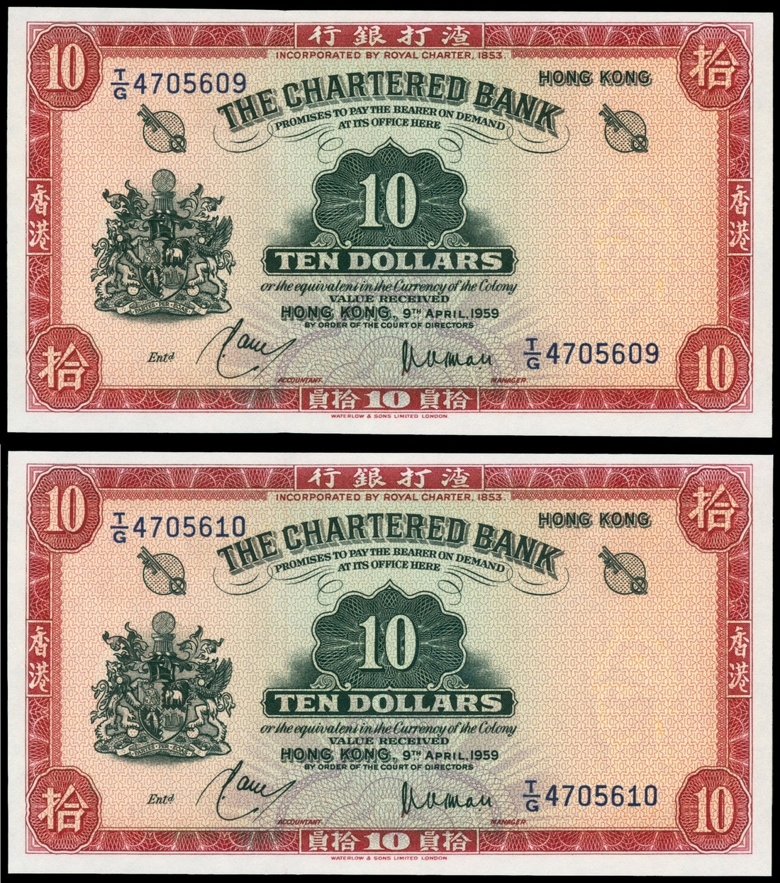 The Chartered Bank, a pair of consecutive $10, 1959, serial number T/G 4705609 - 610, red and multicoloured, keys at left and right, coat of arms at left, reverse red, bank building at centre,