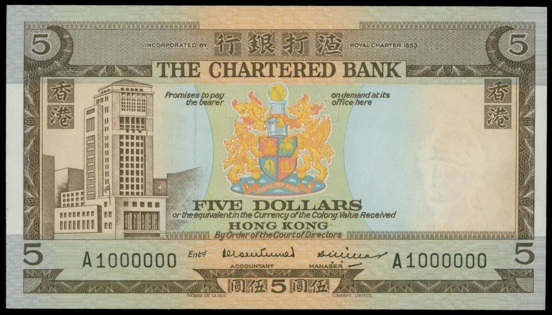 The Chartered Bank, $5, no date, lucky serial number A1000000, brown on multicolour, bank coat of arms at centre, '5' at each corners, modern building at left, watermark of a helmeted warrior at right, reverse brown, modern building,
