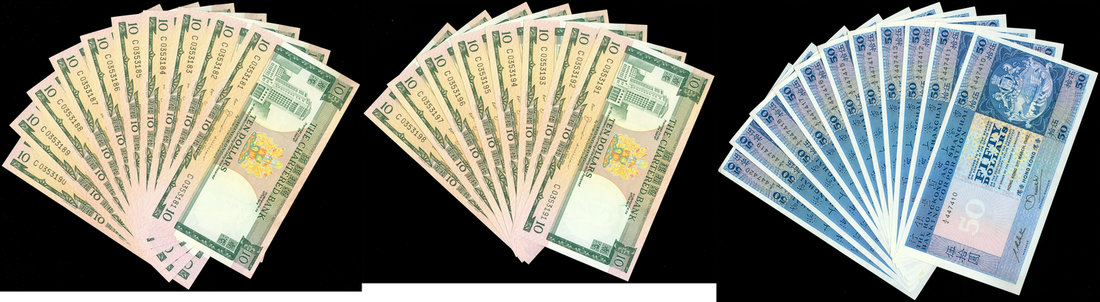 The HongKong and Shanghai Banking Corporation and The Chartered Bank, two consecutive runs of banknotes, Chartered Bank $10, no date, serial numbers C0353181 to 198 (18 pieces) and HSBC $50, 1982, serial number s A/4 447410 to 420 (11 pieces)