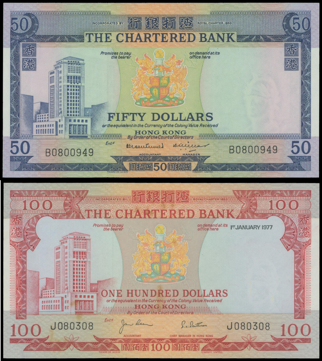 The Chartered Bank, a pair of $50 and $100, ND(1970-75), and 1977, serial numbers B0800949 and J080308, blue and red respectively, the 'House' series,