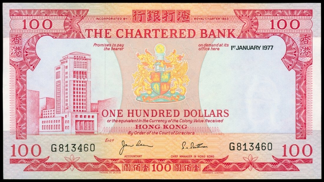 The Chartered Bank, $100, 1.1.1977, black serial G813460, red and multicoloured, arms at centre, bank building at left, Tsim Sha Tsui pier on reverse,
