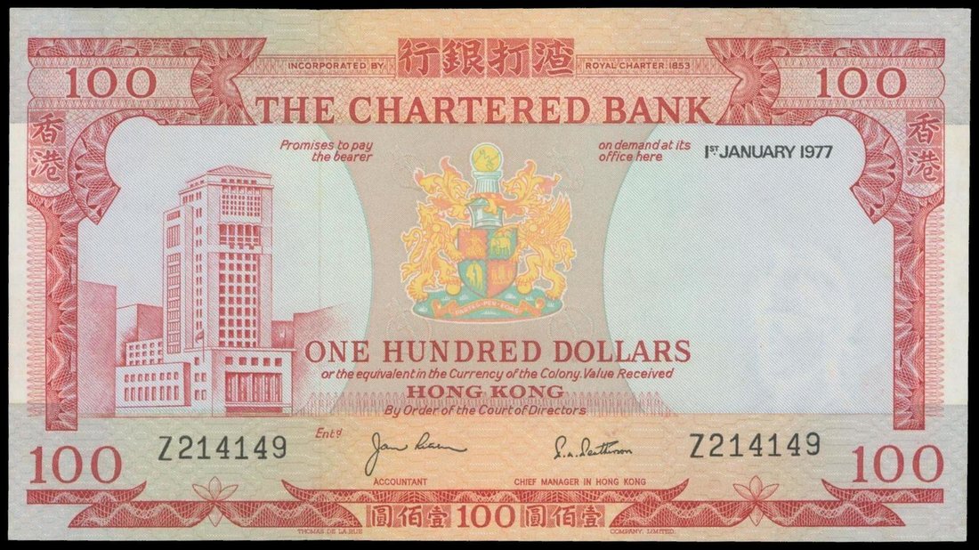 The Chartered Bank, $100, 1.1.1977, a scarce replacement prefx Z214149, red and multicoloured, coat of arms at centre, bank buidling at left, watermark of helmeted warrior at right, reverse red, buildings at centre,