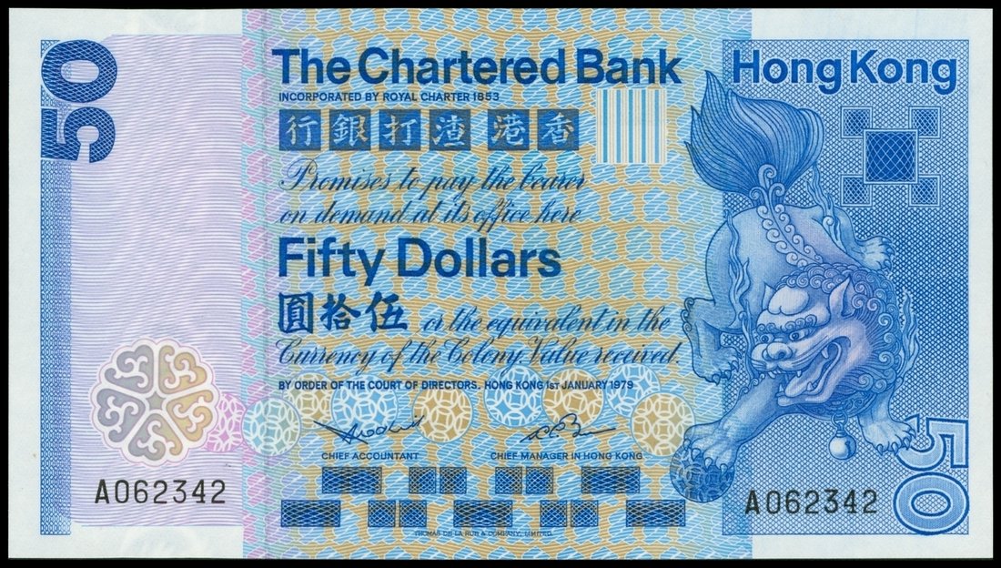 The Chartered Bank, $50, 1.1.1979, black serial A062342, blue and multicoloured, Chinze at right, arms and bank building on reverse,